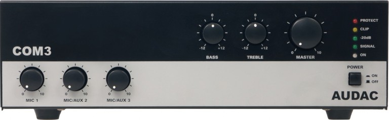 Amplificator PA 30W/100V Audac COM3. Amplificator PA 30W/100V usor de instalat/ utilizat. Dimensiuni: 270 (W) 76 (H) 230 (D) mm. COM3 are 2 intrari de linie stereo neechilibrate si intrare mono echilbrata pentru microfon. Pentru conectarea difuzoarelor, pot fi alese linii de 100V, 70V sau 25V sau 4 ohmi. COM3 ofera posibilitatea conectarii unui pager. Aplicatii: restaurante, hoteluri, magazine, cladiri de birouri, cladiri publice etc. Informatii pe site www.market.audio.ro, sau tel. 0373550217.
