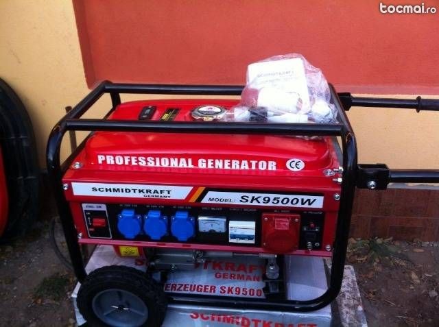 Generator de curent, marca SCHMIDKRAFT, import Germania, nou, putere maxima totala 9500 w, putere nominala totala 7500 w. Generatoarele au iesiri pe urmatoarele tensiuni: