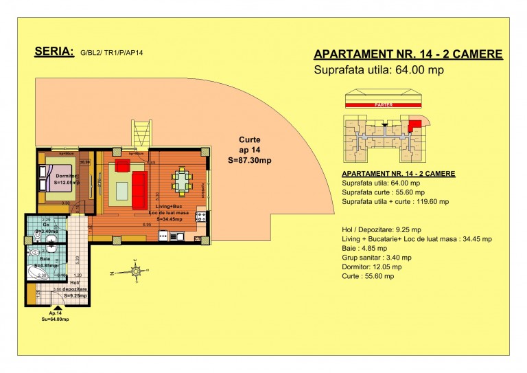 Intr-o zona noua a Brasovului, foarte aproape de Mall Coresi, dezvoltam un ansamblu rezidential cu 2 blocuri, avand 220 de apartamente. Primul bloc este finalizat si locuit iar, al doilea bloc, in care se gaseste acesta garsoniera. Situat pe strada Nicolae Labis nr 52, construit pe o suprafata de aproximativ 10.000 mp si un regim de inaltime de P+2 E + M si sunt realizate arhitectural cat sa permita acelasi grad de lumina in toate apartamentele, ansamblul va beneficia de spatii verzi si alei pavate. Foarte aproape de statia de autobuz - 10 minute de mers pe jos. Garsoniera are o suprafata de 64 mp utili, compartimentat in hol, bucatarie open-space, baie, curte de 55 mp,