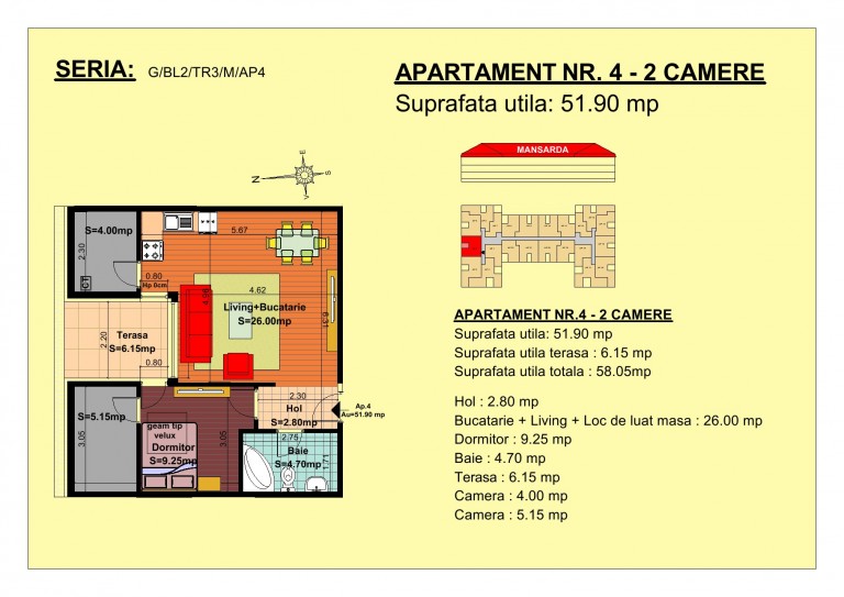 Intr-o zona noua a Brasovului, foarte aproape de zona Mall Coresi, dezvoltam un ansamblu rezidential cu 2 blocuri, cu 220 de apartamente. Primul bloc este finalizat si locuit, al doilea bloc, in care se gaseste acest apartament. Situat pe strada Nicolae Labis nr 52, construit pe o suprafata de aproximativ 10000 mp si un regim de inaltime de P+2 E + Mansarda si sunt realizate arhitectural cat sa permita acelasi grad de lumina in toate apartamentele, ansamblul va beneficia de spatii verzi, alei pavate si zone de joaca. Foarte aproape de statia de autobuz - 10 minute pe jos. Apartamentul are o suprafata de 51.9 mp utili, compartimentat in hol, bucatarie open-space si living, baie, balcon de 6.15 mp, situat la mansarda blocului pe partea de Nord.