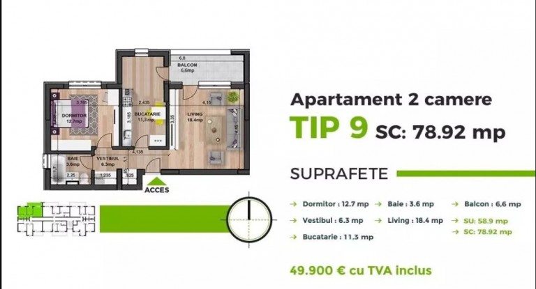 Ap 2 cam, decomandat, bucatarie inchisa, balcon.