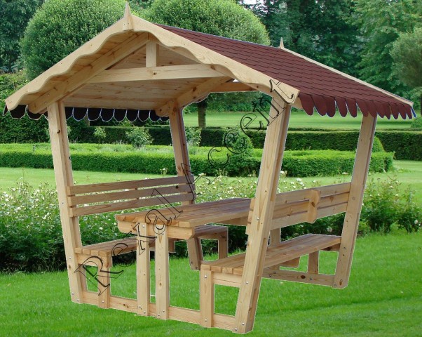 FOISOR din lemn cu masa si scaune (bancute) model REXAL. Mobilier de Gradina din lemn, Set: masa, doua banci (scaune) cu spatar si acoperis din lemn, dimensiuni 2,50 x 2,70m. Foisorul este fabricat din elemente de molid (lemn masiv) si se livreaza sub forma de kit, pregatit pentru o asamblare usoara cu suruburi. Produsul se poate livra tratat cu protectie hidrofuga, impotriva microorganismelor si impotriva razelor UV sau Natur nevopsit sau lacuit si fara invelitoare de acoperis pentru a oferi clientilor posibilitatea de a-l personaliza. Livram in toata tara. Asiguram transportul si/sau montajul contra cost. Date de contact: http://www.rexal.ro; rexalaccent@gmail.com; tel: 0735875773 /0731908032 /0363103948. REXAL ACCENT Bistrita-N. wooden garden gazebo, Pavillon de jardin en bois, gazebo giardino in legno, cenador de madera del jardin, Holz Garten Pavillon Foisoare de gradina, Pavilioane de gradina, Chioscuri de gradina, Filigorii de lemn