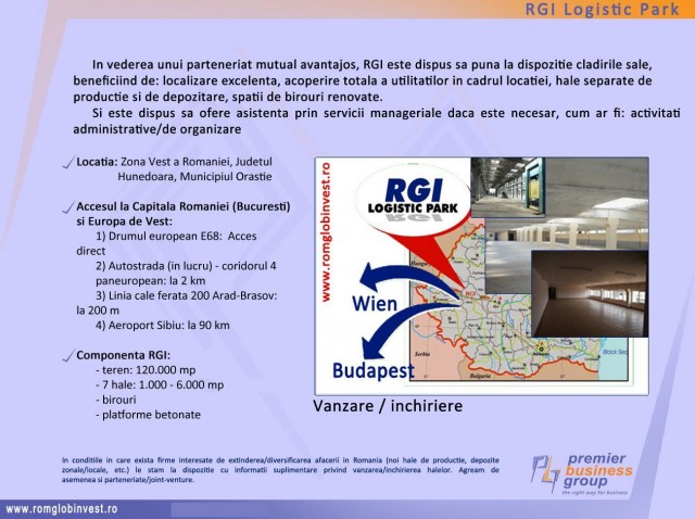 Vanzare Parc Industrial si Logistic RGI. Parcul are o pozitie foarte buna, avand acces la drumul European E68 atat din Est cat si din Vest, afalndu-se aproape de central tarii, amplasat in Orastie, la 85 de km de aeroportul Sibiu si la 20 km de Deva. Suprafata totala a parcului este de 120.000, din care suprafata construita este de 18.000 mp, prevazuta cu 3 platforme betonate, insumand 6000 mp, dotate cu macara turn si o rampa auto. Gradul de acoperire cu utilitati a Parcului Industrial este de 100%: apa, canalizare, curent, gaze naturale, cai de acces. Toate instalatiile sunt verificate si modernizate. Constructia este din caramida, beton si BCA, avand un coefficient ridicat de siguranta la cutremure ( pana la 8,5 grade pe scara Richter). Totodata, va punem la dispozitie consultatnta juridica, servicii de marketing, servicii juridice, echipamente de incarcare. Parcul este compus din hale care se preteaza diferitelor activitati industriale, de productie si comert.