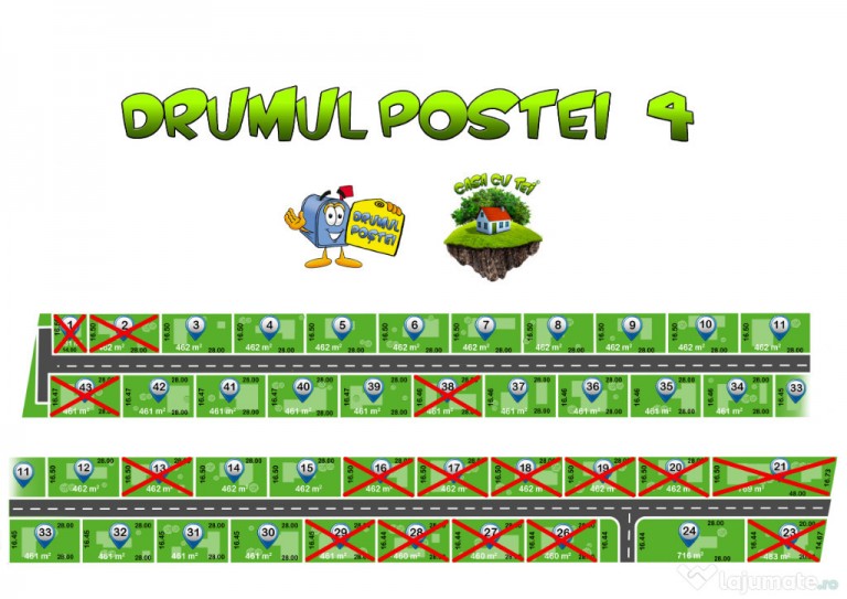 Drumul Privat din interiorul ansamblului are latimea de 7 metri si a fost amenajat cu glederul si compactorul, prin indepartarea stratului vegetal si compactarea fiecarui material folosit: zgura, BCA, balastru, refuz de ciur si piatra de 16-31 cm. Astfel drumul poate fi usor de folosit pentru constructia de locuinte. Toate loturile au fost masurate de un expert cadastral autorizat si intarusate conform coordonatelor cadastrale.