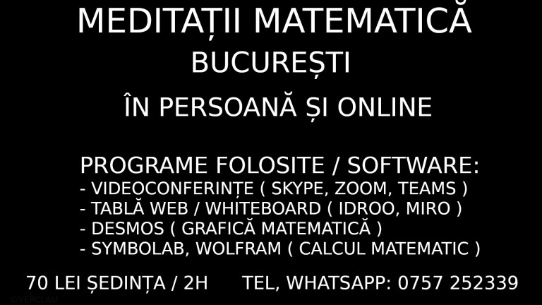 Ofer meditatii online la matematica pentru scoala generala, liceu si facultate. In Bucuresti fac si in persoana. Pentru video conferinte folosesc Skype, Zoom, Teams etc. Pentru tabla online folosesc IDROO, MIRO care sunt gratuite si merg foarte bine. Pentru grafica matematica folosesc DESMOS. Pentru calcul matematic si analiza matematica folosesc SYMBOLAB si WOLFRAM. Se poate vedea in pozele atasate. Plata se poate face in persoana, paypal sau transfer bancar. Pentru mai multe detalii nu ezitati sa ma contactati. Multumesc.