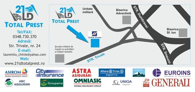 Tot aici la noul BIROU ASIGURARI de pe Str.Trivale nr.24(... din Gura Trivaii-biserica Adventista spre Palatul Copiilor Pitesti, a 3-a casa pe dreapta...) va stam la dispozitie cu:- Asigurari CASCO, -Asigurari CMR, -Asigurari ACC, -Asigurari ACL, -Asigurari IBC, -Asigurari MCS, -Asigurari PAD, -Asigurari RCV, -Asigurari ALTELE(Medica, Medica Plus)