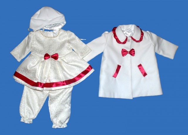 Compleu botez fetite doua culori. Compleul contine jacheta, rochie, pantaloni si palarie.