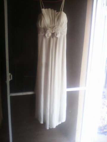 Vand rochie lunga alba, cu modele de trandafiri in partea de sus, in fata si in spate mai lunga ca in parti, purtata o singura data la cununie.