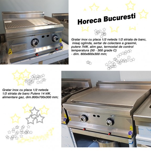 Gratar inox cu placa 1/2 neteda 1/2 striata de banc, finisaj oglinda, sertar de colectare a grasimii, putere 7kW, alim gaz, termostat de control temperatura (50 - 300 grade C)