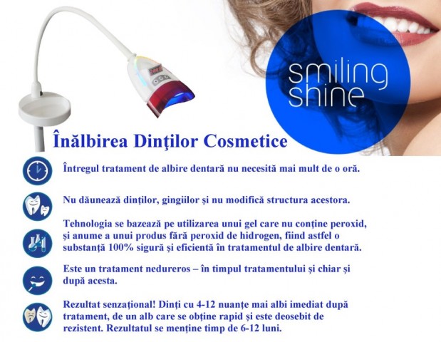 Lampa LED cu lumina rece pentrus albirea cosmetica a dintii. Tara de origine Franta. Exclusivitate Romania si Ungaria. Technologie inovativa, aparuta recent in Romania. Firma momentan se ocupa cu tratamente, dar avem aparate si truse si la vanzare. Cautam in acelasi timp si distribuitori pentru aparate.