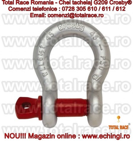 Total Race comercializeaza: chei tachelaj model G 209 tip omega marca Crosby, cheie tachelaj cu bolt filetat, chei tachelaj capacitati intre 0.33 Tone si 55 Tone. Cheile de tachelaj sunt in conformitate cu: EN 13889:2003, indeplinesc cerintele de performanta ale Fed. Spec. RR-C271D tip IVA, grad A, Clasa 2. Chei de tachelaj cu factor de siguranta: MBL = 6 x WLL (Sarcina maxima de lucru), cheie tachelaj: Forjat- Calit si Temperat - Material otel aliat, galvanizata la cald. Capacitatea stantata permanent pe shackles. Cheile de tachelaj peste capacitate WLL= 25 Tone sunt echipate RFID.Cheile de tachelaj Crosby se livreaza cu certificate de calitate CE de la producator. Pentru detalii accesati: www.echingi.ro & www.cheitachelaj.ro