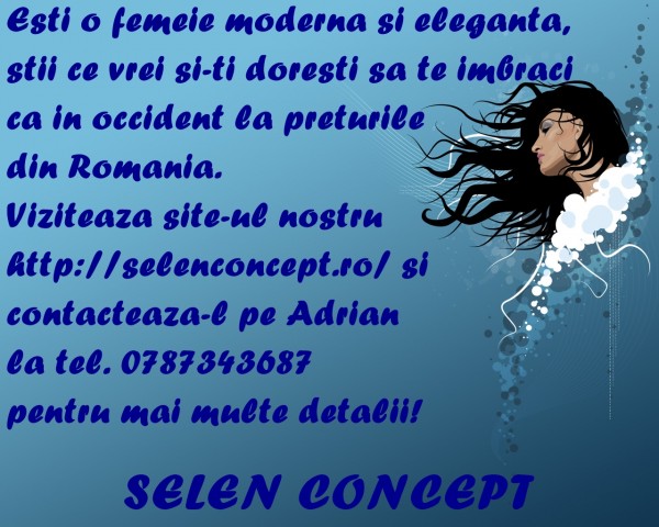 Esti o femeie moderna si eleganta, stii ce vrei si-ti doresti sa te imbraci ca in occident la preturile din Romania. Viziteaza site-ul nostru http://selenconcept.ro/ si contacteaza-l pe Adrian la tel. 0787343687 pentru mai multe detalii! Magazinul nostru online iti sta la dispozitie cu o gama variata de articole vestimentare si de incaltaminte, genti si accesorii de calitate. Descopera preferatele tale, promotiile si comanda acum!