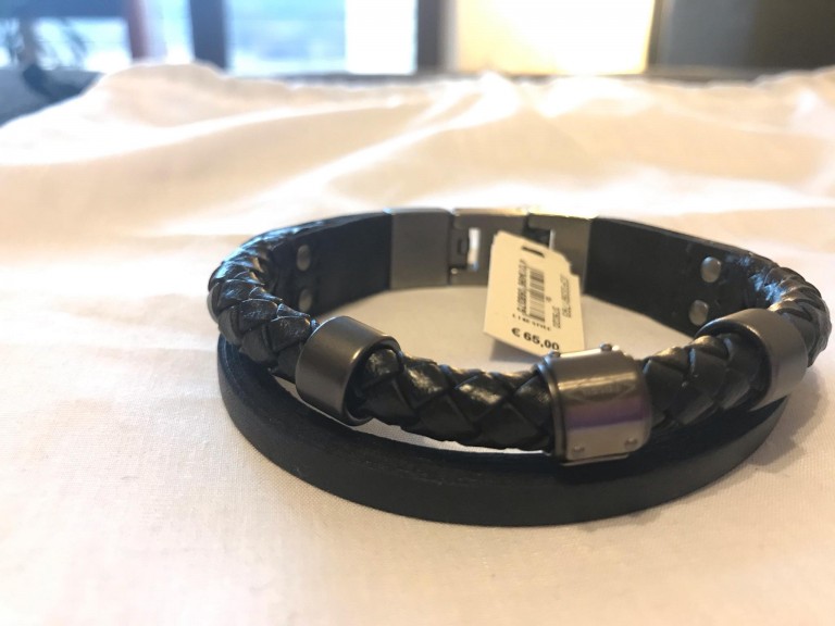 Vand bratara Fossil neagra, de barbati, confectionata din piele naturala, cu baza metalica din otel inoxidabil.