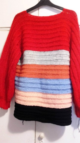 Tricotez rochii, fuste, pluovare, caciuli, ponchouri, fulare, jambiere, lucrate manual la comanda, orice masura, culoare, material sau model. Produsele din imagini au masurile L-XL. Tf. 0726 102 475